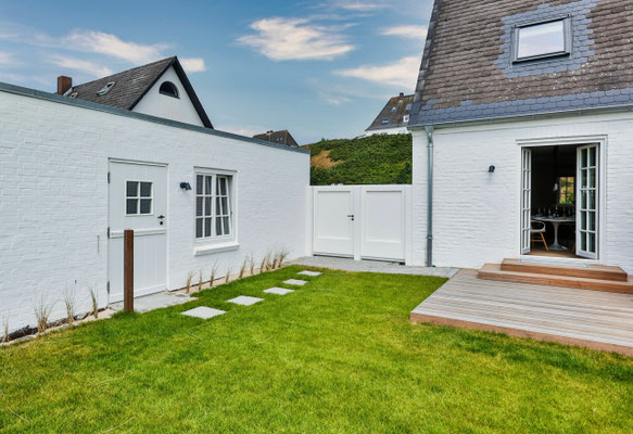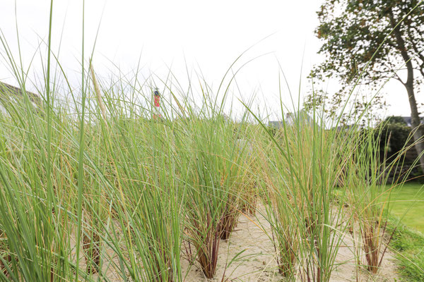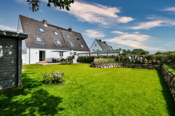 Der Garten ist typisch für Sylt mit Strandhafer, Dünengras, Hortensien und Ölweiden bepflanzt.