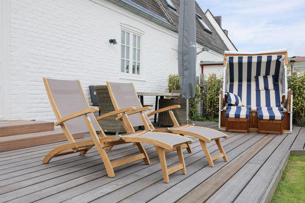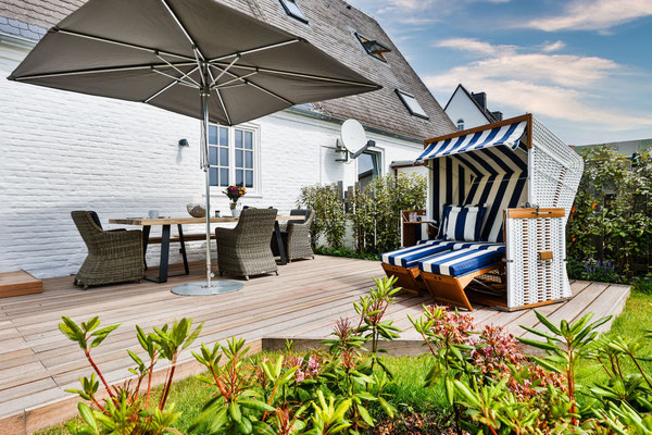 Hochwertige Gartenmöbel und ein Strandkorb (April - Oktober) landen Sie zum Genießen von Sonne und Natur bei Meeresrauschen (abhängig von der Windrichtung) ein. Der Oststrand von Hörnum ist Luftlinie nur 160 m entfernt.