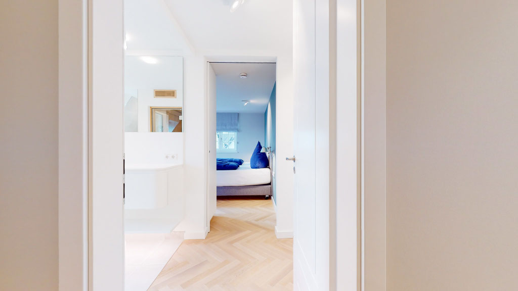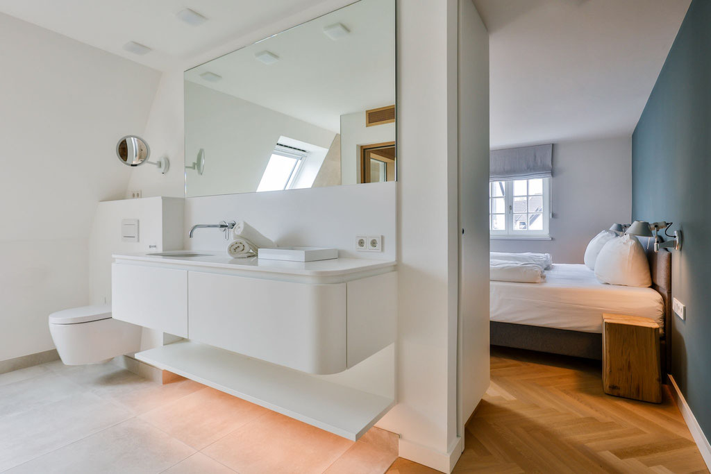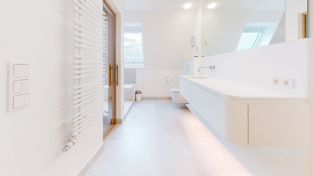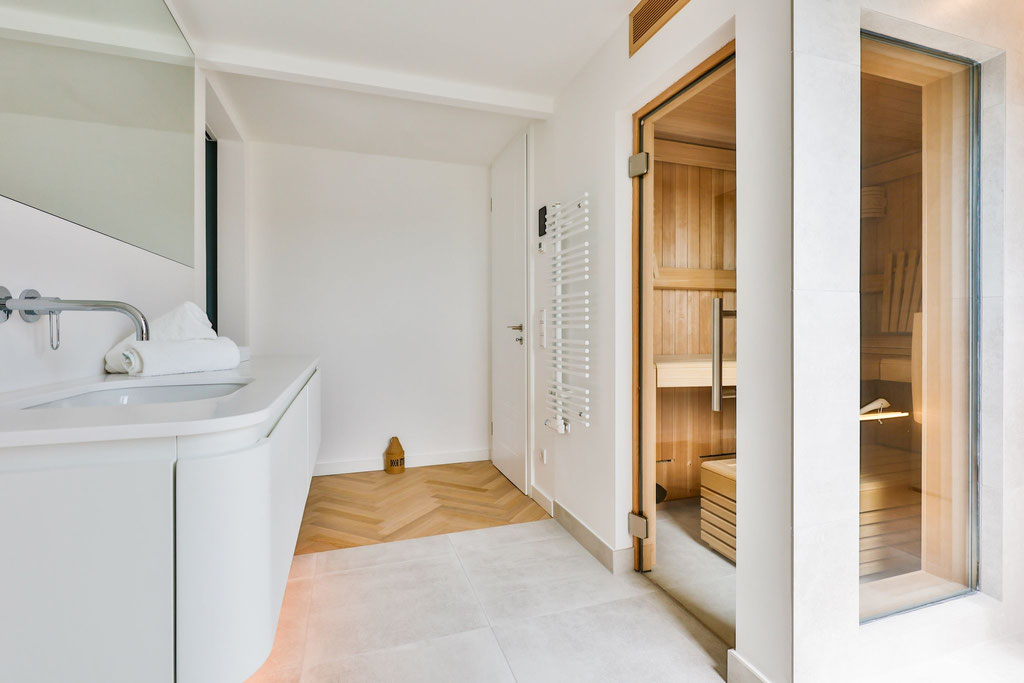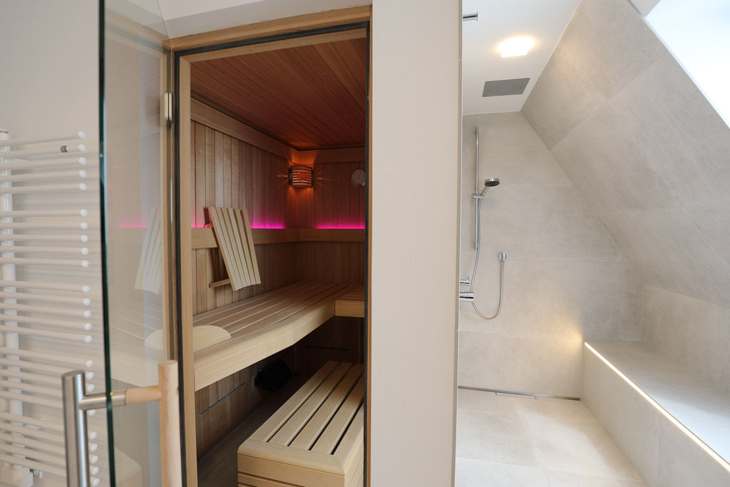 beheizbarem Handtuchhalter, Kosmetikspiegel, Fön, großem Spiegel und Sauna ist elegant, großzügig und funktional.