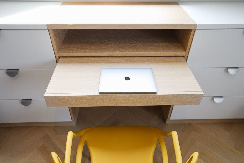 Ein geschreinerter ausziehbarer Tisch mit Stromanschluss unter einem Fenster bietet praktische Arbeitsmöglichkeiten auch für längere Zeiten.