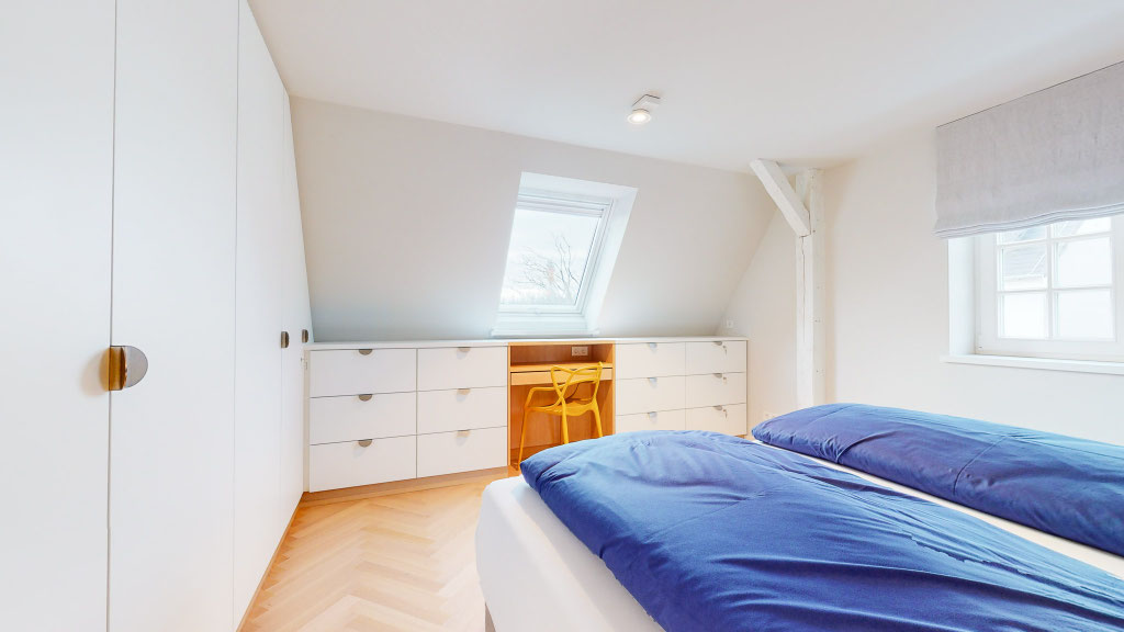Die verdunkelbaren und isolierverglasten Fenster sind in Richtung Süden und Westen ausgerichtet.