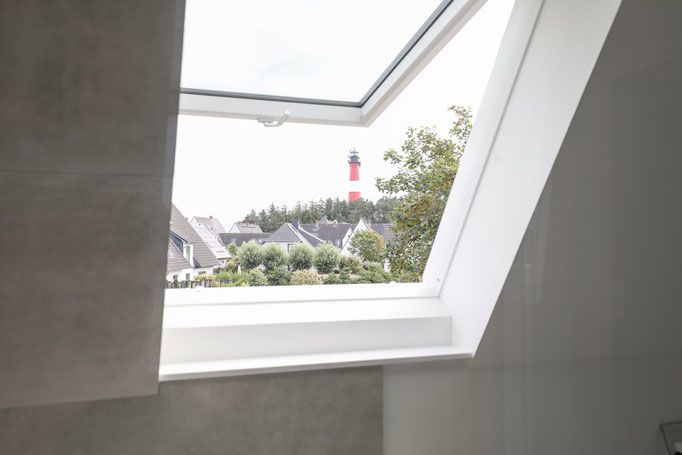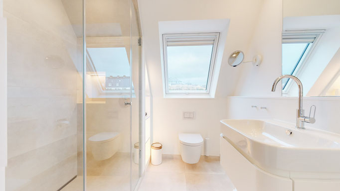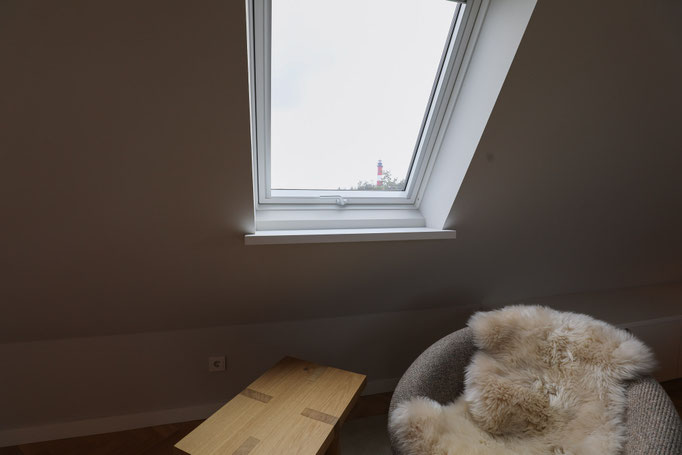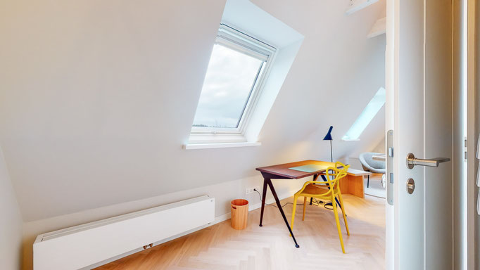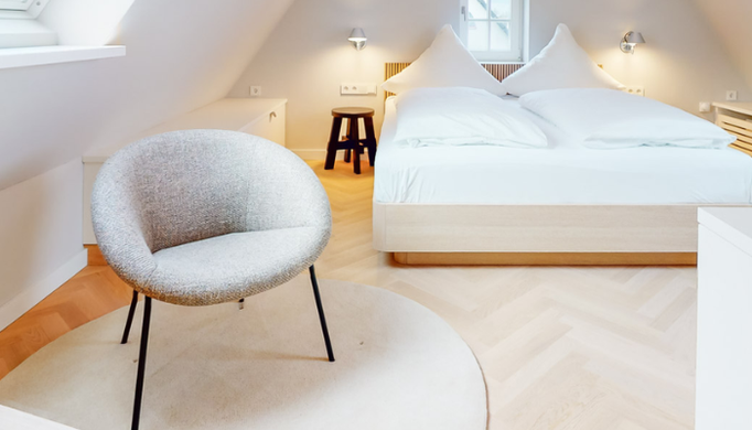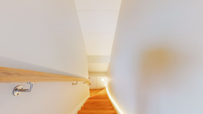 Schon die Treppe mit dimmbarer Lichtleiste und die Sichtflucht durch den Raum mit 37 qm Fläche und dem Fischgrät-Parkett schaffen Leichtigkeit.