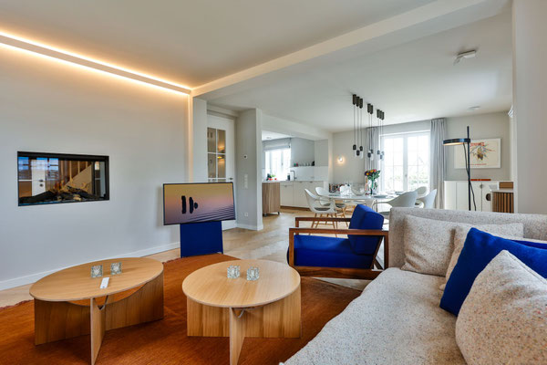 Die großzügige Raumaufteilung wird in der Wohnlounge und dem Übergang zu Ess- und Kochbereich erlebbar.