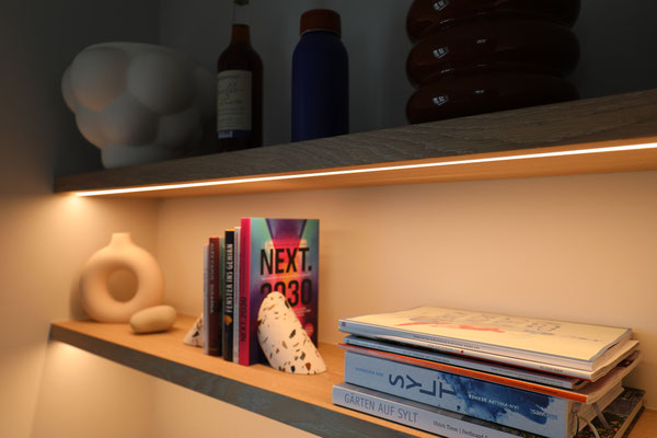 Die weissen Schrankeinbauten werden durch helle, eichholzfarbene Elemente, die wie Objekte wirken, ergänzt.
